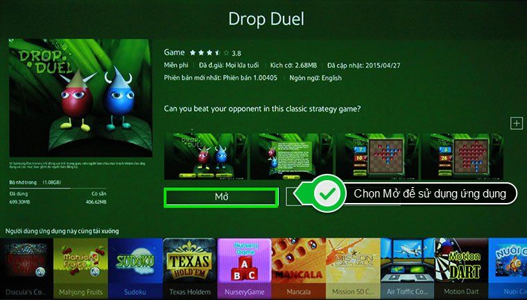 + Ở giao diện Ứng dụng của tivi, chọn danh mục và ứng dụng bạn mong muốn. Ở đây, Điện Máy Người Việt chọn ứng dụng Drop Duel làm mẫu.