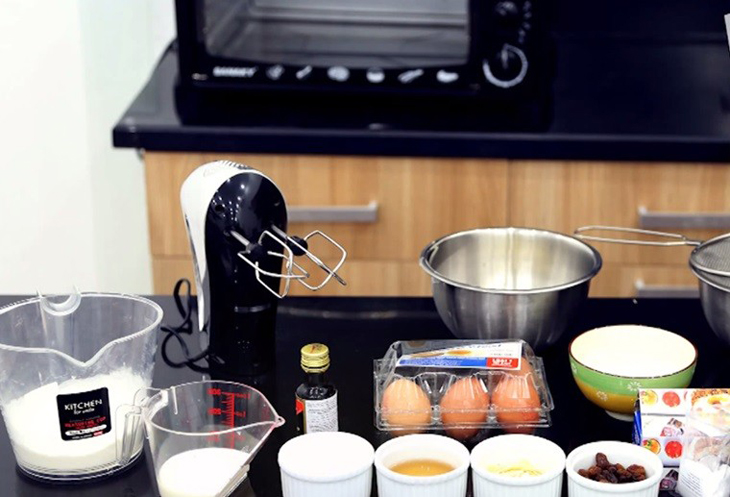 Rưới rượu rum lên nho khô để nho mềm và có mùi thơm. Cắt và lót giấy nến (giấy làm bánh) lên khuôn bánh để dễ lấy bánh ra sau khi nướng xong. Trộn bột nổi, muối vào bột mì, rây lại cho mịn để bánh không bị vón cục.