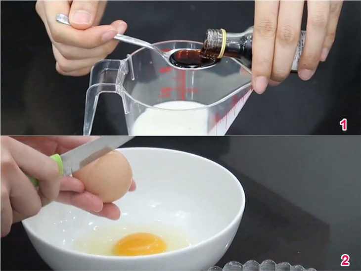 Hòa tan 1 muỗng cà phê vani vào 40 ml sữa tươi không đường. Đập 3 quả trứng cho vào tô, để sang bên.