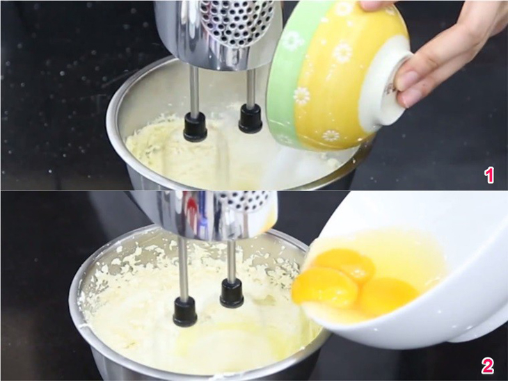 Chỉnh máy sang tốc độ cao, cho từ từ từng quả trứng vào bơ và đánh đến khi tạo thành hỗn hợp mịn.