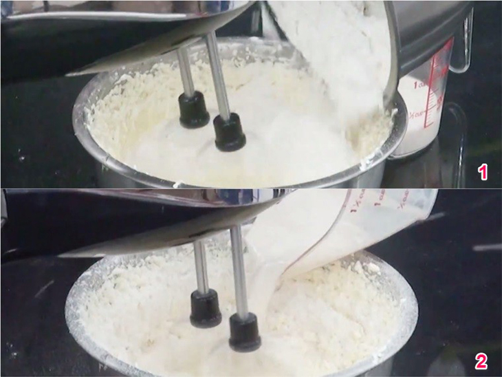 Chỉnh máy đánh trứng xuống tốc độ thấp và đổ từ từ bột đã rây mịn vào tô trộn, đánh thêm một lúc nữa rồi thêm sữa vào tô và trộn đều.
