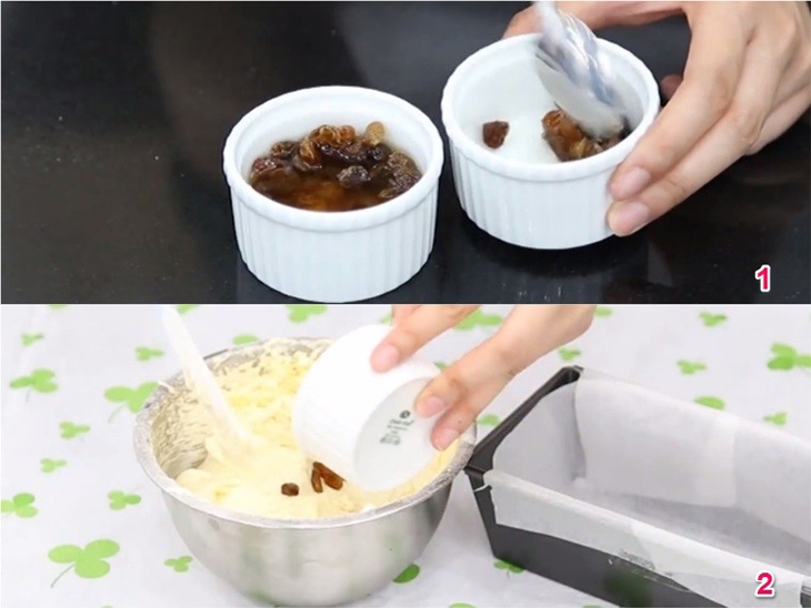 Vớt nho khô ra khỏi rượu rum, cho nho vào tô bột và trộn đều. Chú ý không trộn quá lâu sẽ làm bánh bị chai khi nướng.