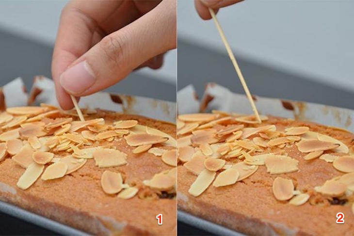 Hết thời gian, lấy bánh ra khỏi lò, dùng một chiếc tăm xiên vào bánh, rút tăm ra thấy sạch là bánh đã chín, để bánh nguội trong khuôn.