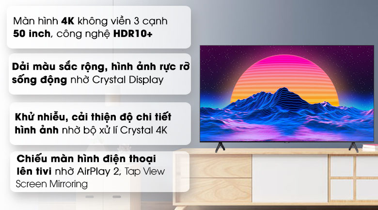 - Bên cạnh đó, với tính năng AirPlay 2 hiện đại, bạn có thể chiếu màn hình các thiết bị của Apple như iPhone, iPad, Macbook lên màn hình tivi UA50TU7000KXXV để tận hưởng các tiện ích giải trí đỉnh cao.