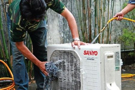 Tháo nắp dàn nóng, dùng máy bơm áp lực nhỏ xịt nước theo dạng tia vào các khe của dàn tản nhiệt nhằm tẩy sạch lớp bụi bẩn, côn trùng bám,… Đồng thời chú ý quan sát xem dàn nóng có được che chắn cẩn thận không, dây tiếp đất còn nguyên vẹn không, …