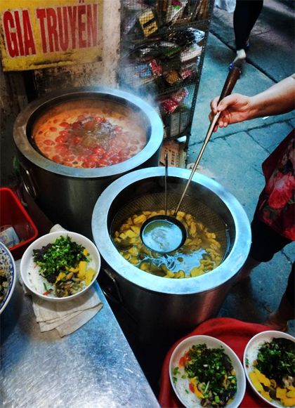 Đặc biệt, ở đây không dùng giấm bỗng (loại giấm làm từ bã nấu rượu nếp) mà dùng nước me (mùa đông) và nước sấu (mùa hè) để tạo độ chua. Rất thơm, chua tự nhiên mà không phải lo về nguồn gốc giấm bỗng không biết chế từ thứ gì. Hãy tránh giờ cao điểm (từ 11h đến 13h) nếu không muốn phải đợi chờ quá lâu, đôi khi mất cả nửa tiếng mới đến lượt.