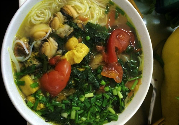 Kẻ si mê mô tả bát bún ốc như một bức tranh đầm hồ nhiệt đới lúc hoàng hôn, với nước dùng loang loáng sắc đỏ ánh tà dương nhờ cà chua bổ cau và ớt chưng. Dưới làn nước thanh và chua, lập lờ sắc đen vàng của miếng ốc giòn sừn sựt, xanh mướt sắc hành hoa, sực nức vị tinh dầu của tía tô. Tất cả như bồng bềnh nhưng không lạc lõng nhờ những sợi bún trắng ngần cố kết mọi thứ lại với nhau.