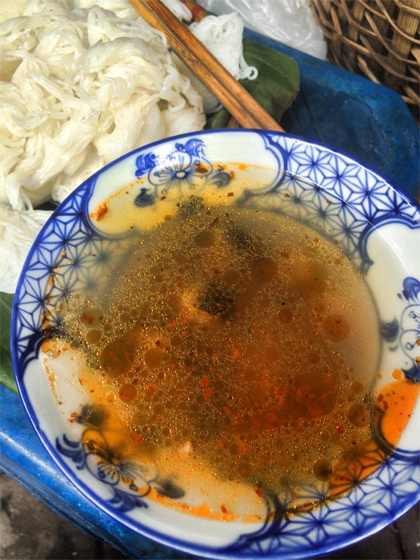 Và sự chờ đợi đến khi được bưng cái tô chiết yêu men xanh lên ngang mặt, ngắm nghía cái công trình bấy lâu thèm khát, được ghé môi vào húp miếng nước chua chua, cay cay, nồng nồng mà không béo ngấy như các thức bún phở khác, mới thấy nghẹn ngào làm sao. Những giọt lệ âm thầm rời khóe mắt. Vì cay hay vì con tì con vị được thỏa mãn khát khao.