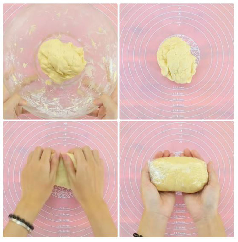 + Khi đã trộn hết bột vào tô thì bạn lấy hỗn hợp ra nhào thật nhanh tay sao cho bột dính lại thành khối mịn và dẻo.