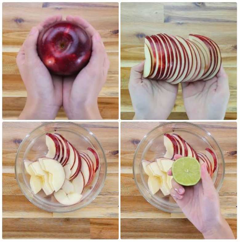+ Để táo không bị thâm đen, bạn cho táo cắt lát vào tô nước đá lạnh, vắt vài giọt nước cốt chanh vào tô, đảo đều.
