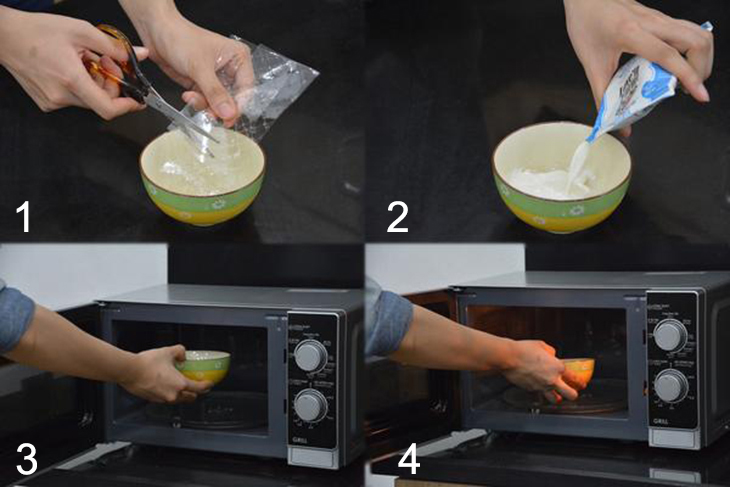 Cho thêm 50 ml sữa vào rồi đem bỏ vào lò vi sóng, vặn công suất trung bình thấp, quay trong vòng 2 phút