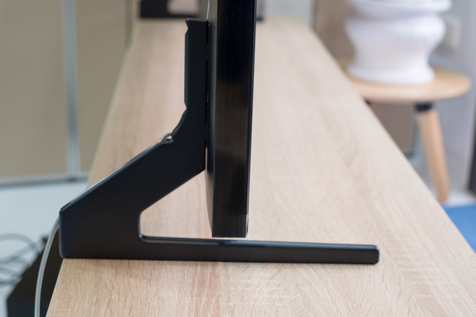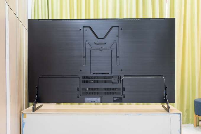 Các bạn có thể thấy mặt sau của TV ở bức ảnh trên. Nhận thấy các đường rãnh được khoét vào bên trong để hỗ trợ việc đi dây cáp hoặc treo tường. Chất liệu kim loại phay xước nằm bằng phẳng song song với mặt trước thay vì cong sẽ khiến TV áp sát tường hơn.