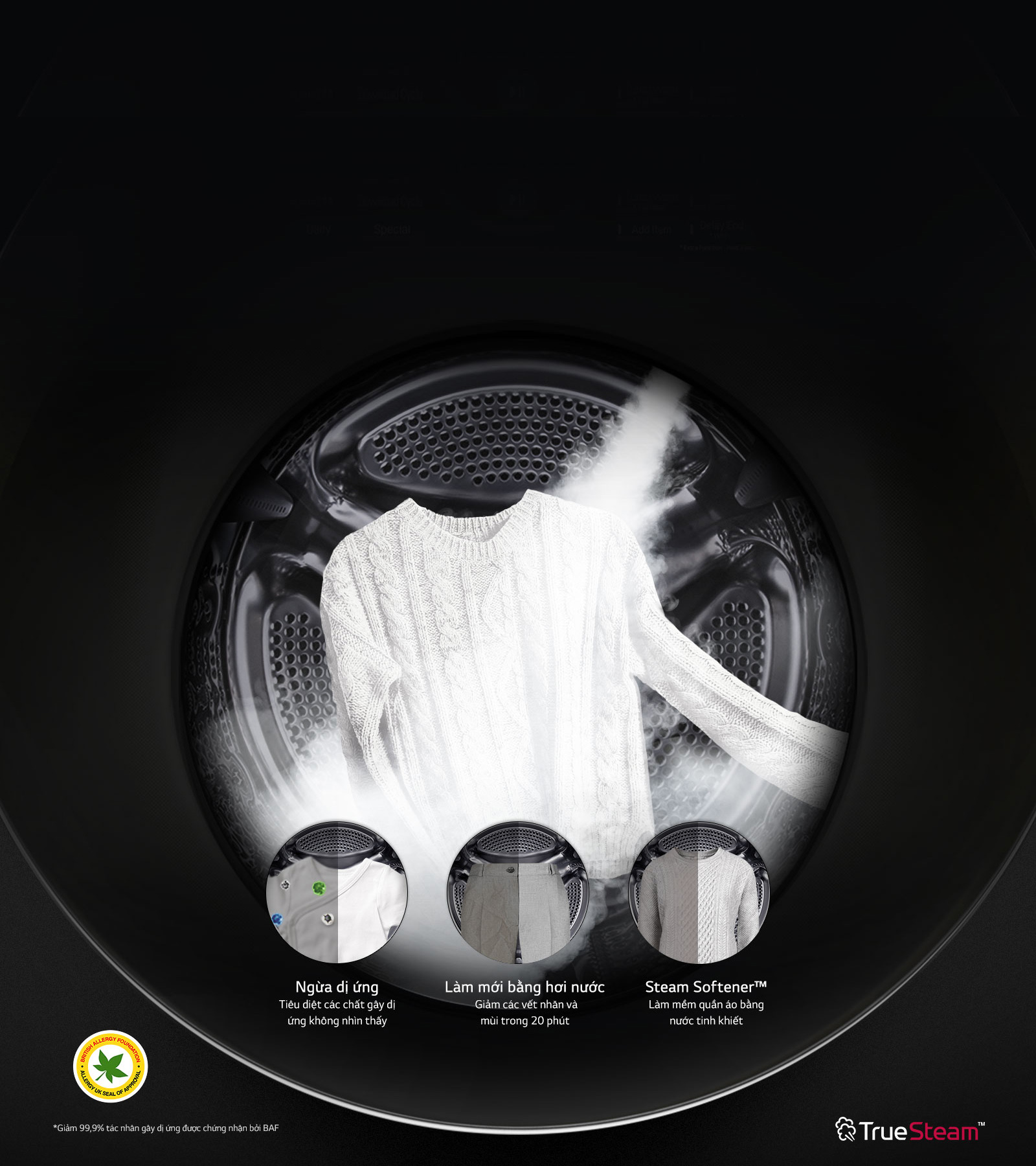 hơi nước từ công nghệ Truesteam có khả năng diệt khuẩn, khử trùng và loại bỏ các yếu tố gây dị ứng hiệu quả đến 99.9%. Vì thế bạn hoàn toàn yên tâm khi giặt quần áo cho các thành viên trong gia đình hay thú nhồi bông của trẻ nhỏ mà không lo ảnh hưởng đến sức khỏe.