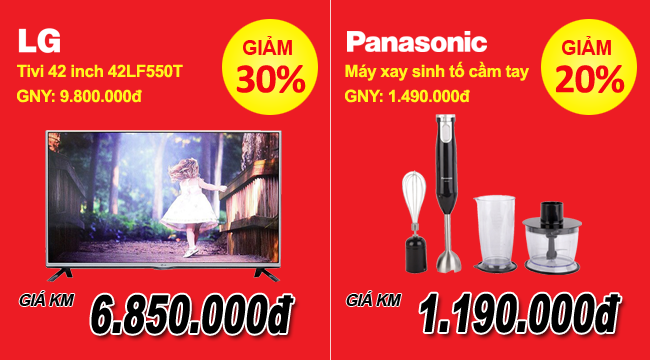 Cụ thể như, Tivi LG 42 inch 42LF550T giảm giá đến 30% giá chỉ 6.850.000đ, Máy xay sinh tố cầm tay Panasonic MX-SS1BRA giảm giá đến 20% giá chỉ 1.190.000đ, Máy giặt Electrolux 7.5 kg EWF-85743 giảm giá đến 10% giá chỉ 7.590.000đ…
