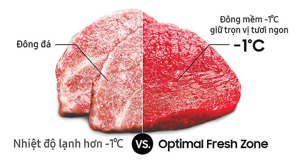 Cũng như hầu hết những hãng sản xuất tủ lạnh hiện nay, tủ lạnh Samsung được trang bị ngăn đông mềm Optimal Fresh Zone riêng biệt có thể bảo quản thực phẩm tươi sống ở nhiệt độ thấp (-1 độ C).