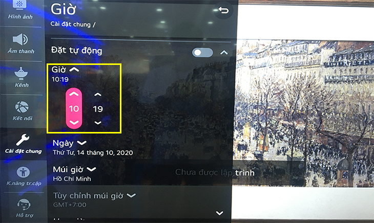 Chọn giờ và phút tại thời điểm bạn cài đặt tivi, trong hình là "10:19".