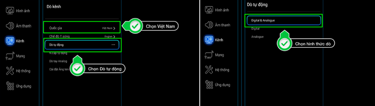 Ở mục chọn quốc gian, bạn nhấn chọn Việt Nam, tiếp theo chọn Dò tự động và chọn Digital & Analogue.