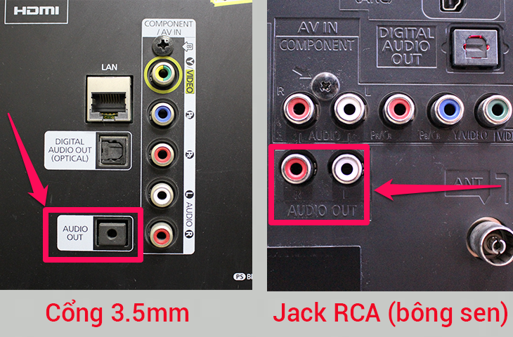 Đầu tiên bạn cần xác định tivi bạn có cổng xuất âm thanh chuẩn nào để chọn dây kết nối cho phù hợp (xem hình dưới). Thường là cổng 3.5mm hoặc là jack RCA (bông sen).