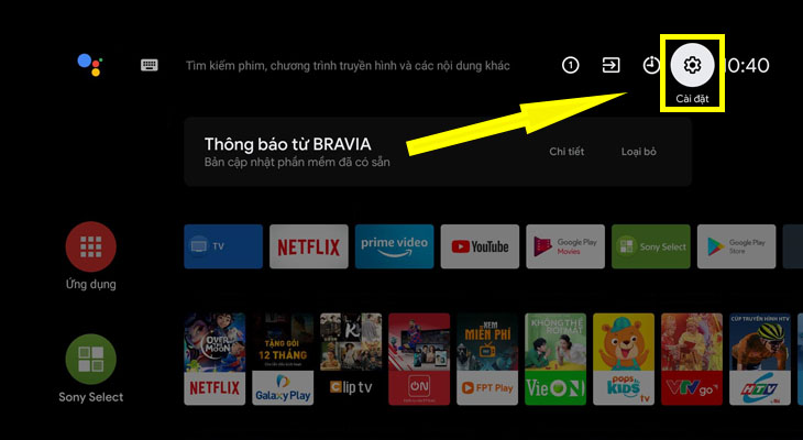 Bước 2: Chọn "Cài đặt"/"Setting" trên góc phải của màn hình tivi.