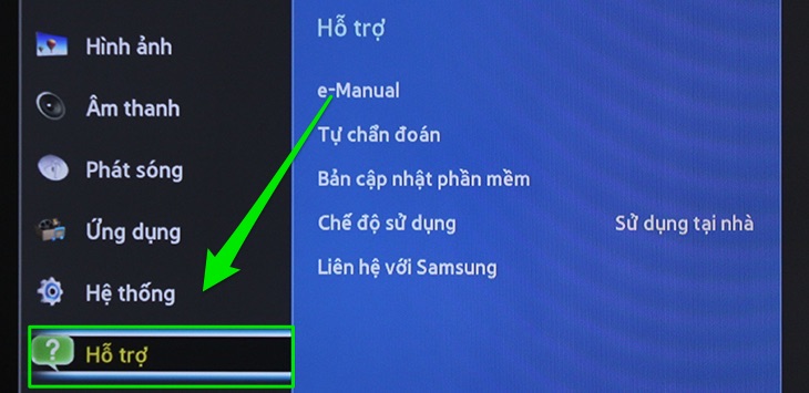 Bước 1: Nhấn nút MENU trên remote ---> chọn Hỗ trợ ---> chọn Tự chuẩn đoán.