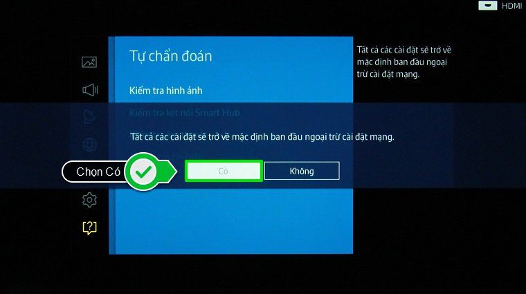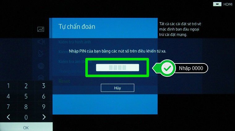 Bước 3: Bạn chọn tiếp vào Reset trong Tự chuẩn đoán. Lúc này, tivi sẽ yêu cầu nhập mã pin, bạn nhập vào 0000, sau đó chọn Có để xác nhận. Tivi sẽ tiến hành khôi phục cài đặt gốc và khởi động lại.