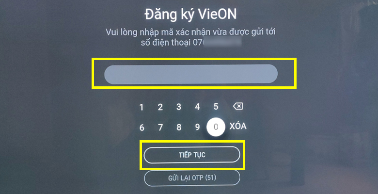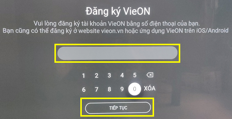 Bước 4. Bạn nhập số điện thoại để đăng ký VieOn -> "Tiếp tục".