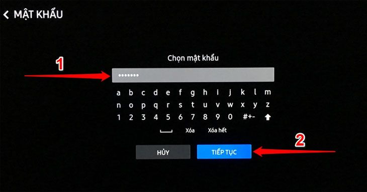 Bước 10: Ở ô nhập mật khẩu, hãy dùng điều khiển tivi để tạo một mật khẩu bảo mật cho tài khoản của mình và chọn "Tiếp tục". Mật khẩu này dùng để đăng nhập những lần sau, hoặc nhập trên một thiết bị khác.
