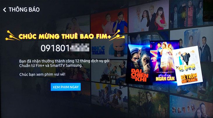 Thông báo dành cho tivi Samsung nhận gói Fim+ xem phim chiếu rạp mới nhất.