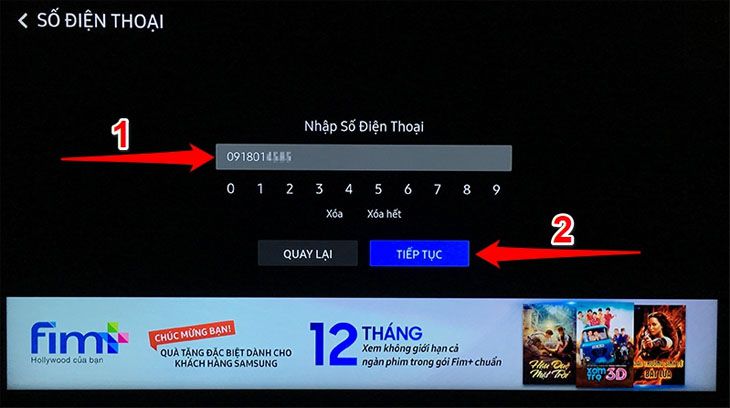 Bước 7: Nhập số điện thoại của bạn bằng điều khiển và nhấn "Tiếp tục". Lưu ý: số điện thoại này chưa đăng ký Fim+ lần nào.