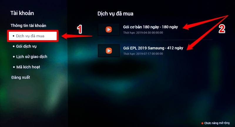 Bạn xem ở bên phải có 2 mục khuyến mãi là "Gói cơ bản 180 ngày" và "Gói EPL ngoại hạng anh 412 ngày" là chính xác.
