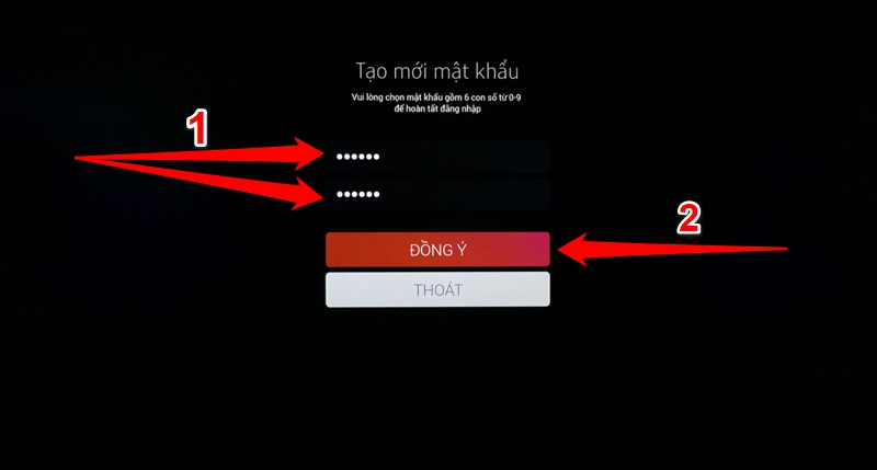 Bước 7: Màn hình sẽ hiện ra khung tạo mật khẩu mới bạn nhập 6 chữ số giống nhau vào 2 khung (1) > chọn "Đồng ý" (2).