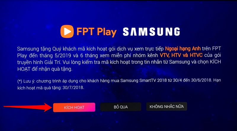Bước 8: Màn hình sẽ hiện ra khuyến mãi FPT Play dành cho tivi Samsung 2018 > bạn chọn "Kích hoạt".