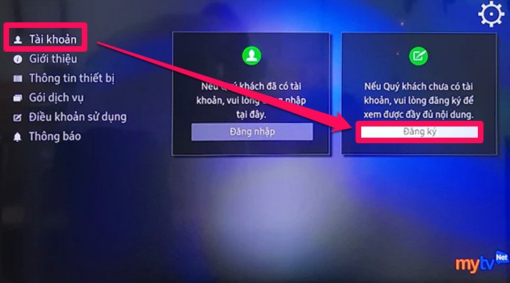 Bước 4: Bạn chọn mục "Tài khoản" sau đó chọn "Đăng ký" để tiến hành đăng ký tài khoản.
