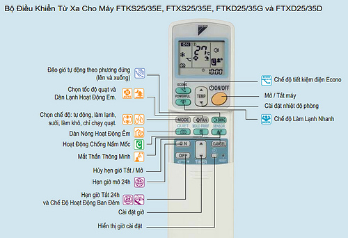 Các chức năng trên bộ điều khiển từ xa của các loại máy khác nhau đều giống nhau. Chúng chỉ khác nhau về hình dáng, cách bố trí các nút điều khiển. Ở đây lấy bộ điều khiển của điều hòa Daikin làm ví dụ.
