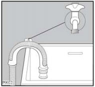 + Móc trên rìa của bồn thoát nước dùng ống nhựa có cấp theo máy. Trong trường hợp này phải giữ cho đầu ống không bị tụt ra khi máy đang tháo nước. Có thể dùng dây cột đầu ống sát vào vòi nước hay đính ống vào tường.