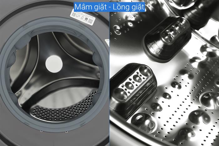 Lồng giặt sấy bằng thép không gỉ sáng bóng, bền bỉ, hạn chế mảng bám, giữ quần áo luôn sạch sẽ.