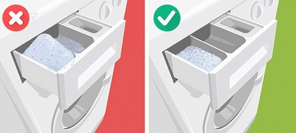 Nhiều gia đình có suy nghĩ cho càng nhiều bột giặt thì quần áo càng giặt sạch, đây là suy nghĩ hoàn toàn sai. Nếu bạn cho quá nhiều bột giặt vào ngăn đựng của máy thì bột giặt sẽ khó hòa tan hết mà bám lại quần áo, tích tụ cặn bẩn ở lồng máy giặt là điều kiện khiến cho vi khuẩn nấm, mốc sinh sôi và phát triển. Bên cạnh đó việc đổ bột giặt trực tiếp vào quần áo thì khả năng hòa tan bột giặt càng thấp hơn.