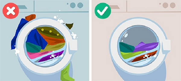 Việc giặt quần áo quá nhiều so với khối lượng giặt cho phép trong một lần giặt khiến máy giặt bị hư hỏng các linh kiện bên trong, giảm tuổi thọ. Khi đó quần áo sẽ chuyển động thành một khối, không thể quay theo guồng xoay của dòng nước và bột giặt sẽ không thể tan. Nên quần áo sẽ không thể giặt sạch hoàn toàn, các vết bẩn cứng đầu cũng không bị đánh tan được. Ước lượng số quần áo cần giặt sao cho gần bằng với khối lượng mà máy đã quy định, không cho quần áo quá 2/3 lồng giặt. Các loại áo len, quần jean, áo khoác thường sẽ nặng hơn các loại quần áo khác.