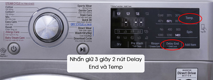 Tính năng bật/tắt âm thanh thường không được thể hiện trên bảng điều khiển của máy giặt LG. Tuy nhiên bạn vẫn có thể kích hoạt tính năng này bằng cách nhấn và giữ đồng thời nút Temp và Delay End trong 3 giây để bật/ tắt tiếng bíp thông báo.