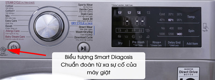 Trên máy giặt LG thường có biểu tượng hình chiếc điện thoại gần nút nguồn. Đây là chức năng sử dụng ứng dụng Smart Diagnosis trên điện thoại thông minh để nhân viên LG có thể chuẩn đoán từ xa sự cố mà máy giặt bạn đang gặp phải.