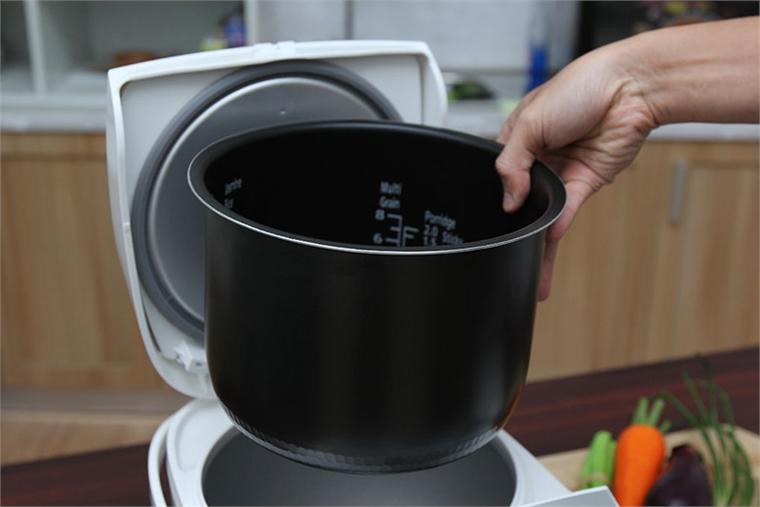 Lòng nồi nhôm dập 6 lớp phủ bột kim cương chống dính bền bỉ, 3 mâm nhiệt và công suất 750 W giúp cơm chín nhanh mà vẫn tiết kiệm điện