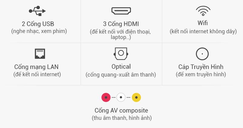 Bạn có thể cắm USB vào tivi để nghe nhạc, xem phim, hay kết nối tivi với máy tính qua cổng HDMI. Trong khi đó, cổng Optical trên tivi sẽ cho phép bạn kết nối tivi với loa, dàn âm thanh với chất lượng âm thanh cao chỉ với một sợi cáp duy nhất.