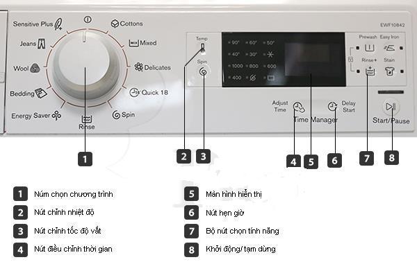 Bảng điều khiển trên máy giặt Electrolux là sự kết hợp hài hòa giữa nút bấm, nút xoay và bảng thông số. Khác biệt của bảng điều khiển trên máy giặt Electrolux là sử dụng ngôn ngữ tiếng Anh. Tuy nhiên, ở từng vị trí đều có hình minh họa dễ hiểu, người dùng có thể hoàn toàn an tâm sử dụng.