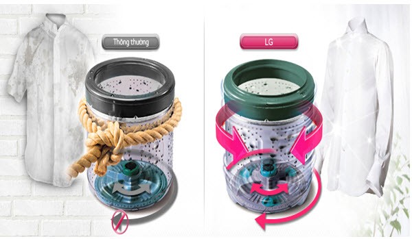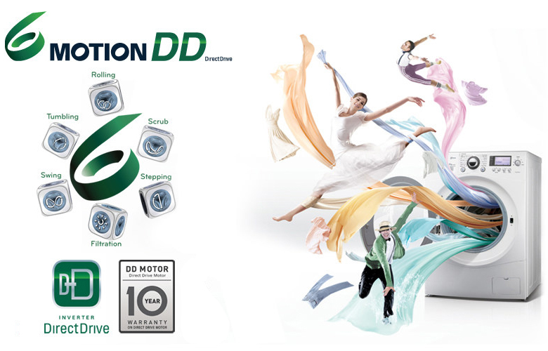 Nhắc đến máy giặt LG, người dùng nghĩ ngay đến những công nghệ đời mới hiện đại được tích hợp trên máy giặt. Một trong những công nghệ mới nhất là công nghệ giặt 6 chuyển động – 6Motion DD. Công nghệ 6 chuyển động của LG mô phỏng quá trình giặt bằng tay của con người với 6 giai đoạn: Chà xát – Quay – Nhào trộn – Đảo – Nén – Đập, giúp việc giặt giũ hiệu quả hơn, đồng thời nâng niu chất lượng vải vóc, mang đến độ bền đẹp cho quần áo.