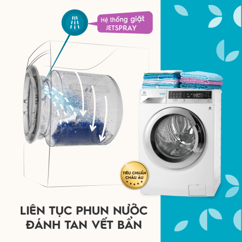 Với máy giặt Electrolux nổi bật với công nghệ Jetspray có tác dụng làm tăng tính tuần hoàn của dòng nước, nước tác động nhanh và đều lên áo quần thông qua khả năng phun nước trực tiếp lên quần áo nhờ vòi phun được trang bị ở phía cửa trước. Nhờ vậy, lượng bột giặt được hòa tan tối đa và thẩm thấu tốt hơn trong quần áo, chất lượng giặt giũ cũng được nâng cao đáng kể.