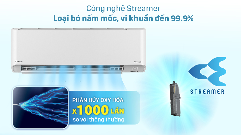 Streamer là một thiết bị tạo dòng điện electron tốc độ cao, được gắn phía trong dàn lạnh của máy. Công nghệ Streamer giúp phân hủy virus, vi khuẩn có hại bằng phương thức phân hủy oxy hóa.