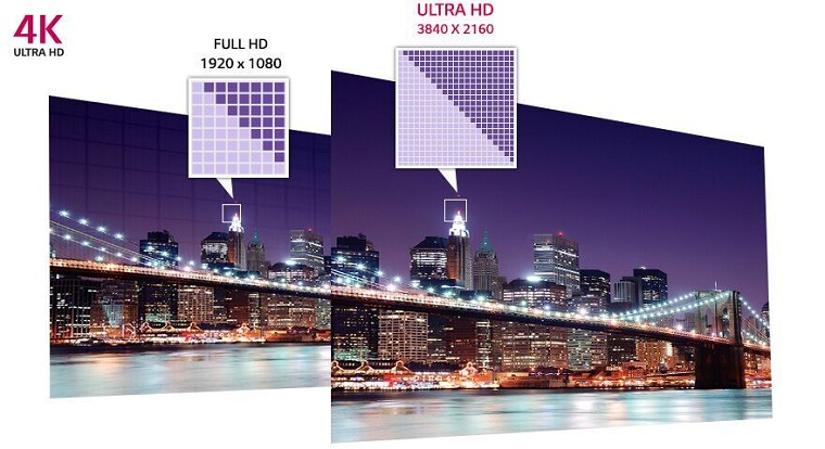 Nếu ta so sánh tivi có độ phân giải 4K với các độ phân giải phổ biến trên tivi hiện nay như Full HD và HD thì độ phân giải 4K cho những ưu điểm vượt trội hơn về độ sắc nét, chi tiết hơn, đặc biệt là khi tận hưởng trên những tivi có màn hình lớn.